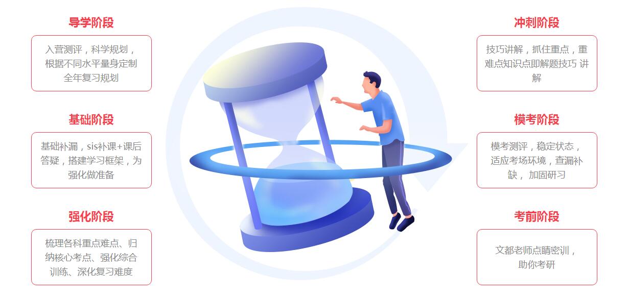 文都考研全年集训营培训机构凭借丰富的教学经验和对历年试题的准确把握,针对考研英语、政治、数学、管理类联考、专业课,从基础-强化-进阶-冲刺,将教师讲授的知识化作系统解题能力,有效良好的教辅体系,帮助每一位考研学员全力以赴,全方面有效的提高考研成绩。